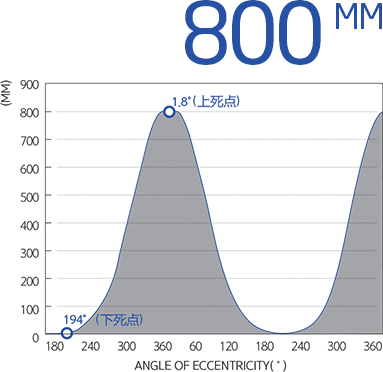 使用了肘桿(KNUCKLE-JOINT)壓力機的驅(qū)動方式并在連桿(CONNECTING ROD)部分增加了連接關(guān)節(jié),因此滑塊下降時呈現(xiàn)肘桿式壓力機的柔和的運動曲線形態(tài),滑塊上升時可像曲柄壓力機一樣進行快速的歸位。這樣的滑塊運動曲線可在產(chǎn)品成型時減少壓力機沖擊速度(Reduced impact speed)。由此即可延長壓力機的加壓成型時間,可生產(chǎn)前、后方擠壓的高品質(zhì)的產(chǎn)品并提高生產(chǎn)速度。